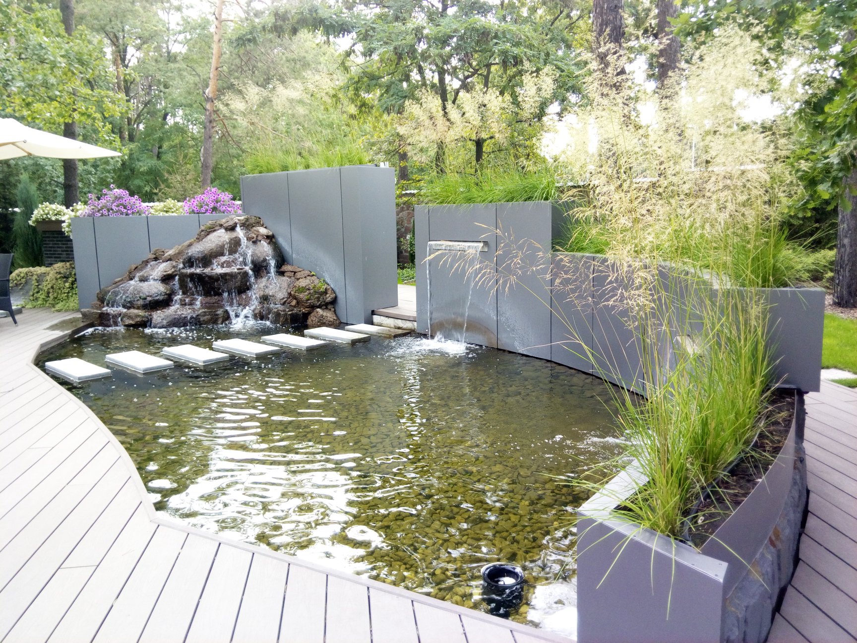 МС Ландшафт занимается устройством водяных участков. Мы осуществляем полный комплекс мероприятий, касающихся этого направления деятельности. Проектирование, подбор необходимых материалов и систем, создание бассейнов и водовместилищ, оснащение водой и другими услугами для оформления идеального декора для дачи, частного коттеджа или любой области вокруг водной поверхности. Наше агентство предоставляет сервисы обустройства по приемлемой стоимости, на которую влияет география места, стройматериалы, тип строительных мероприятий и их объем.